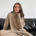 Amara αντιπροσωπεύει απόλυτη άνεση με μια πινελιά κομψότητας. Αυτό το Σετ πλεκτών παντελονιών ρολόκρεμας συνδυάζει ένα μαλακό πουλόβερ με ταιριαστό παντελόνι και δημιουργεί μια αρμονική, κομψή συνολική εικόνα. Το ελαστικό πλεκτό υλικό αγκαλιάζει ευχάριστα το δέρμα και προσφέρει ελευθερία κινήσεων, χωρίς να χάνει το σχήμα του. Ιδανικό για χαλαρές μέρες ή κομψές στιγμές homewear – Amara είναι το πρότυπο της άνεσης και του στυλ.