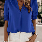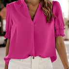 Η Sophia – Μπλούζα V Λαιμόκοψη Κοντά Μανίκια είναι η τέλεια επιλογή για να εμπλουτίσετε την γκαρνταρόμπα σας με ένα κομψό και ευέλικτο κομμάτι. Κατασκευασμένη από υψηλής ποιότητας σιφόν και πολυεστέρα, συνδυάζει άνεση, αναπνοή και κομψότητα. Η άνετη γραμμή της και ο εκλεπτυσμένος σχεδιασμός την καθιστούν ιδανική μπλούζα για το γραφείο όπως και για ανεπίσημες εξόδους. Ένα πρακτικό και μοντέρνο απαραίτητο που προσαρμόζεται σε όλες τις εποχές.